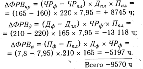 Как видно из приведенных данных, имеющиеся трудовые ресурсы предприятие использует недостаточно полно. В среднем одним рабочим отработано по 210 дней вместо 220, в связи с чем сверхплановые целодневные потери рабочего времени составили на одного рабочего 10 дней, а на всех — 1650 дней, или 13118ч (1650 х 7,95).