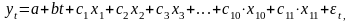Спрогнозируем объем производства с помощью модели регрессии с включением фактора времени и фиктивных переменных. Модель для помесячной динамики имеет вид: