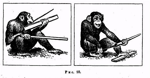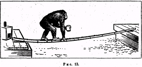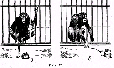 Слід підкреслити обмеженість і примітивність думки тельной діяльності вищих тварин. Мавпа, наприклад, будуючи піраміди з ящиків, часто ставить великі ящики на маленькі, часом намагається «приклеїти» ящик до бічної стінки приміщення, сходи намагається поставити без упору, посеред клітки. Мавпа з декількох тасьм вибирає ту, за яку можна підтягнути чашку з кормом, але не зрозуміє, що в Не яких випадках треба потягнути відразу за два кінця тасьми (рис. 12).