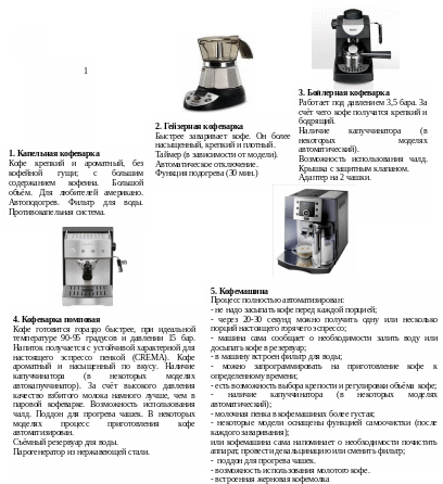 На сегодняшний день существует множество бытовых аппаратов для приготовления кофе на любой вкус. Кофеварки можно разделить на капельные (фильтрационные), гейзерные (мокка), кофеварки «Эспрессо» и кофемашины.