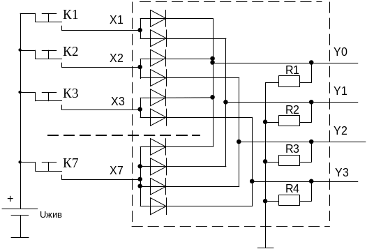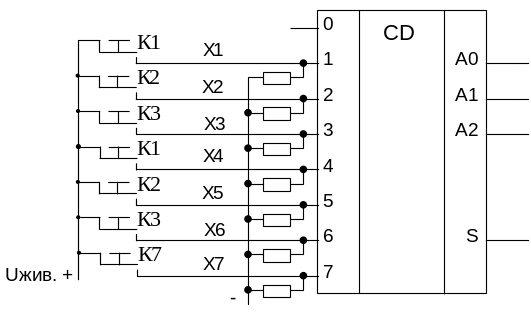 При розімкнених ключах К1-К7 на всіх виходах шифратора присутні логічні "0", що зумовлено підключенням до вихідних шин резисторів "підтяжки" R1-R4. При натисканні будь-якої кнопки напруга від джерела живлення через замкнений ключ, включені в провідному напрямку діоди (по два для ключів К1-К6 і чотири – для К7) буде подана на ті чи інші виходи, формуючи відповідний код згідно з таблицею 1.