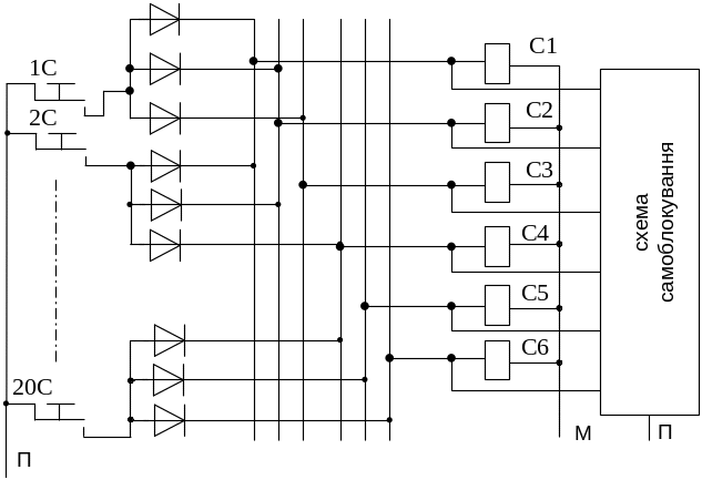 За таким принципом побудовано шифратор адресної частини коду команд ТУ в ДЦ "НЕВА". Оскільки код ТУ (рисунок 2) складається з 18 двійкових розрядів, для реєстрації якості кожного розряду ("0" або "1") використовують 18 електромагнітних реле. Для формування логічної одиниці в коді відповідне реле необхідно включити, для формування "0" виключити. В залежності від призначення частини коду вказані реле мають позначення С1 – С6 (вибору станції), Г1 – Г4 (вибору групи об’єктів керування), Р1 – Р8 (реєстраціі команди). Згідно з правилом формування адресної частини коду ТУ три з шести реле С повинні бути включені, три виключені. Вибір лінійного пункту, на адресу якого буде передаватись команда, здійснюється натисканням станційних кнопок 1С-20С (максимальна кількість керованих ЛП – 20). Спрощена схема шифратора адреси лінійного пункту наведена на рисунку 7.