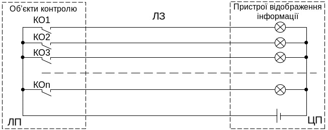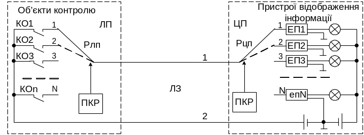 В залежності від стану об’єктів контролю контакти КО1-КОn замикають або розмикають електричні кола індикаторних ламп пристроїв відображення. Наведена схема і спосіб контролю характеризується простотою технічної реалізації (необхідні лише контакти контрольних реле, провідники лінії зв’язку та індикатори пристроїв відображення), миттєвою реакцією на зміну стану об’єктів. Недоліком вказаного способу є необхідність виділення для контролю N об’єктів min N+1 провідників лінії зв’язку. Вже при відстані від лінійного пункту до поста керування 5‑10 км витрати кабельної продукції настільки збільшують вартість системи керування, що вона, з економічної точки зору, стає неефективною. Таким чином, для мінімізації витрат на побудову системи потрібно мінімізувати необхідну для забезпечення зв’язку кількість фізичних лінійних кіл.