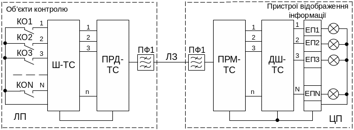 Для мінімального завантаження каналу зв’язку повідомлення про стан об’єктів передаються, звичайно, після зміни стану об’єкта контролю (спорадичний спосіб передавання інформації). Шифратор Ш-ТС формує n-розрядний код повідомлення і надсилає його до передавача ПРД-ТС. В передавачі здійснюється перетворення коду в сигнал – в залежності від значення двійкового розряду коду змінюються параметри імпульсних ознак елементів повідомлення. На приймальному боці приймач ПРМ-ТС відтворює код повідомлення і надсилає його до дешифратора ДШ-ТС. По результатах дешифрації відбувається запис прийнятого повідомлення в елементи пам’яті для подальшого відображення.