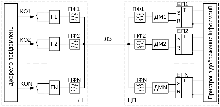 Смуга частот лінії зв’язку розподіляється на частотні ділянки в залежності від кількості контрольованих об’єктів. Інформація про стан об’єкта (1 або 0) відтворюється наявністю або відсутністю змінного струму відповідної частоти в каналі. Функціональні перетворення повідомлень полягають у наступному: множині двійкових повідомлень N ставиться у відповідність еквівалентна множина з N сигналів, які відрізняються імпульсними ознаками; сумарний сигнал, що відображує стан джерела повідомлень, передається в лінію. На приймальному боці сумарний сигнал розкладається на складові і здійснюється перехід від множини сигналів до початкової множини двійкових повідомлень. У наведеному прикладі інформація про стан контрольованих об’єктів КО1‑КОN надходить на входи керування генераторами Г1–ГN. В залежності від стану контактів контрольних реле в лінію зв’язку передається/(не передається) змінний струм відповідної частоти. На центральному посту здійснюється виділення частот сигналів смуговими фільтрами ПФ, демодуляція (демодуляторами ДМ), і запис інформації в елементи пам’яті (ЕП) для подальшого відображення.