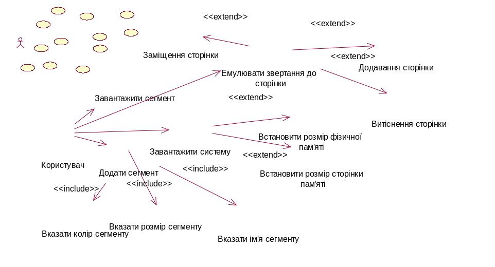 Основним прецедентом системи є емуляція звертання до сторінки. Він виконує основну функціональну роль системи. При звертанні до сторінки пам’яті, вона може бути відсутня у фізичній пам’яті і її потрібно завантажити із зовнішньої. В таких випадках може виникати ряд проблемних ситуацій, зв’язаних в першу чергу відсутністю вільного місця в фізичній пам’яті. Тому повинна бути реалізація алгоритмів додавання, витіснення і заміщення, що зображено відповідними прецедентами на діаграмі. Основним алгоритмічним суб’єктом в даному випадку є алгоритм заміщення. В різних архітектурах використовують різні реалізації таких алгоритмів.