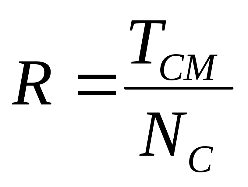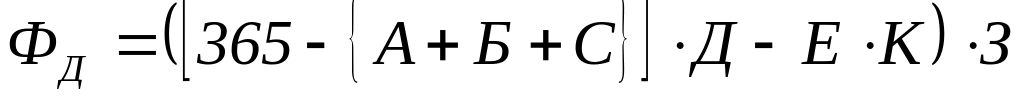 где ФД – фонд рабочего времени в часах; 365 – число календарных дней в году; А – число выходных дней в году; Б – число праздничных дней в году; С – продолжительность отпуска (в среднем) в году, в рабочих днях; Д – продолжительность рабочего дня в часах; Е –количество предпраздничных дней в году; К – сокращение длительности рабочего дня в предпраздничные дни (принимают равным 1 ч); З – коэффициент, учитывающий невыходы рабочего по болезни и другим причинам, предусмотренным трудовым законодательством (принимается равным 0,96).