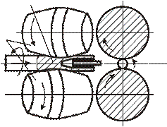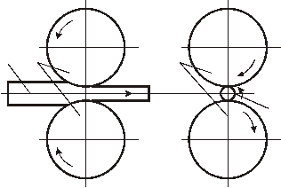 Широкое распространение получили двухвалковые станы поперечно-винтовой прокатки при производстве заготовок шаров подшипников качения. Ручьи валков выполнены по винтовой линии, а оси валков установлены под некоторым углом друг к другу, рис. 2.7.