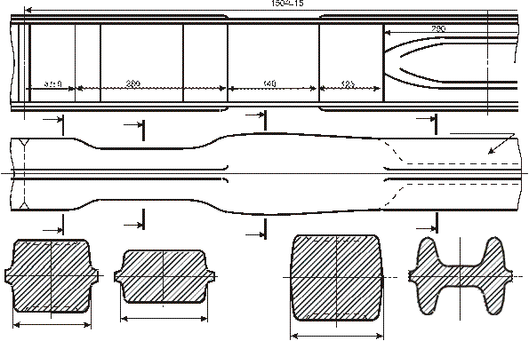 На рис. 2.8 представлен чертеж поковки передней оси грузового автомобиля, а на рис. 2.9 – периодический профиль, используемый для получения данной поковки методом горячей объемной штамповки. Коэффициент использования металла при этом достигает порядка