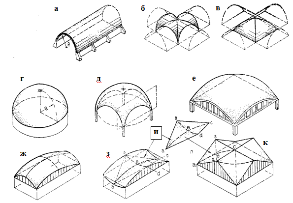 а – цилиндрический свод; б – крестовый свод; в – сомкнутый свод; г – купол; д – парусный свод; е– пологая оболочка; ж – бочарный свод; з – лотковый свод; и– поверхность в форме гиперболического параболоида; к – покрытие из четырех оболочек в форме гиперболического параболоида