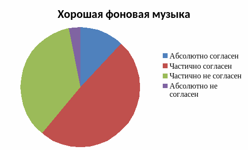 В этой позиции абсолютно согласились – 12 человек, частично согласились – 49 человек, частично не согласились – 36 человек, 3 человека полностью не согласны с этим. Из этого следует, что музыка в ресторане, в принципе, не плохая и удовлетворяет посетителей.