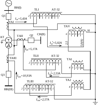 2. Производится выбор параметров выравнивающих автотрансформаторов (ТLn), трансреактора (ТАV) и промежуточных ТТ (ТАn) цепи торможения. За основную сторону принята сторона основного питания 220 кВ.