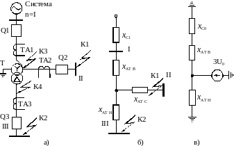 2. При составлении схем замещения для расчета дифференциальной защиты рассматривается режим раздельной работы автотрансформатора (рис.7.1.,а). Сопротивления обмоток автотрансформатора (в зависимости от положения переключателя РПН) определяются для минимального, среднего и максимального значений регулируемого напряжения. Предварительно выбираются соответствующие напряжения UК,% данного типа автотрансформатора: