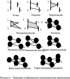 Принципы отображения геометрических примитивов библиотеки OpenGL иллюстрируются рисунком 2, где цифрами обозначена последовательность задания характерных точек в программе рисования.