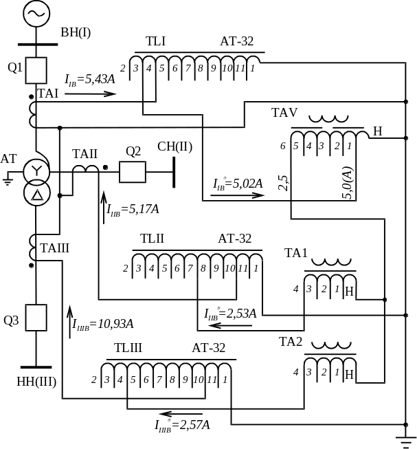 1. Определяются расчетные первичные и вторичные номинальные токи для всех сторон защищаемого автотрансформатора, соответствующие его проходной мощности.