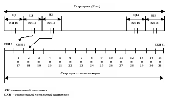 Канальный интервал (КИ) – промежуток времени, отводимый для передачи кодовой группы одного канала. Нулевой канальный интервал используется для цикловой синхронизации. КИ 1-15 и 17-31 используются для передачи информации пользователя (8 бит).