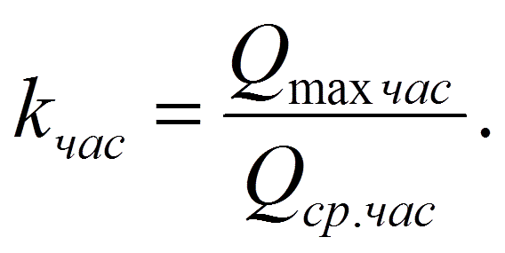 Колебания водопотребления (разбора воды из водопровода) происходит в очень короткие промежутки времени, измеряемые минутами и даже секундами, однако, при расчетах условно принимают, что в течение 1 часа водопотребление постоянно. Т.е. считают, что суточное водопотребление колеблется только по часам. Отношение Qmaxчасрасхода к среднему часовому расходу Qср.час называется коэффициентом часовой неравномерности.