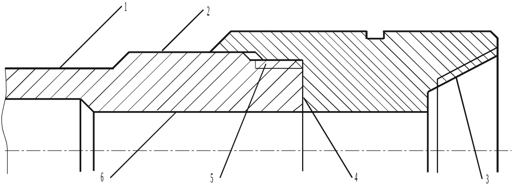 Для повышения прочности труб в резьбовых соединениях разработаны трубы НК с высадкой на их концах внутрь и наружу. На рисунке показаны конструктивные особенности трубы ВК. Мелкая трубная и замковая резьбы трапецеидальные типа ТТ с углом профиля в 300; резьбы удлинены по сравнению с резьбами труб 1,2 типа, конический поясок 2 снимает часть нагрузки с резьбового соединения и уплотняет его; упор 4 предотвращает довинчивание резьбы 5. Такое резьбовое соединение, хотя и упрочненное, остается слабым звеном в трубе.