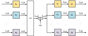 1) На передающей стороне первичные сигналы Сi(t), поступающие на входы каналов системы передачи. Данные сигналы могут одновременно существовать в одинаковых или перекрывающихся спектрах частот. В устройствах Мi осуществляется формирование отличающихся друг от друга канальных сигналов Si(t). Процесс преобразование первичного сигнала Ci(t) в канальный Si(t) можно представить аналитически