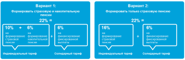 В зависимости от выбора гражданина варианта пенсионного обеспечения в системе ОПС, 16% взносов индивидуального тарифа либо полностью идут на формирование страховой пенсии, либо 6% из них идут на формирование накопительной пенсии, а 10% – на формирование страховой пенсии.