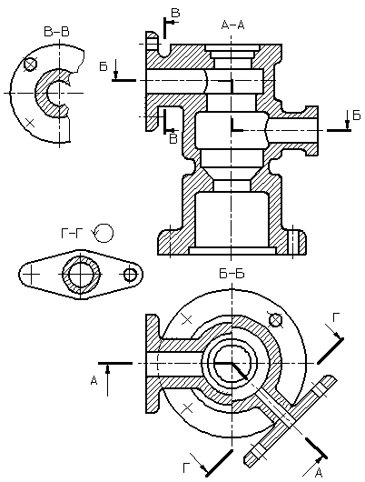 сложные – при нескольких секущих плоскостях (например, разрез А-А, черт. 1; разрез Б-Б, рис. 6).