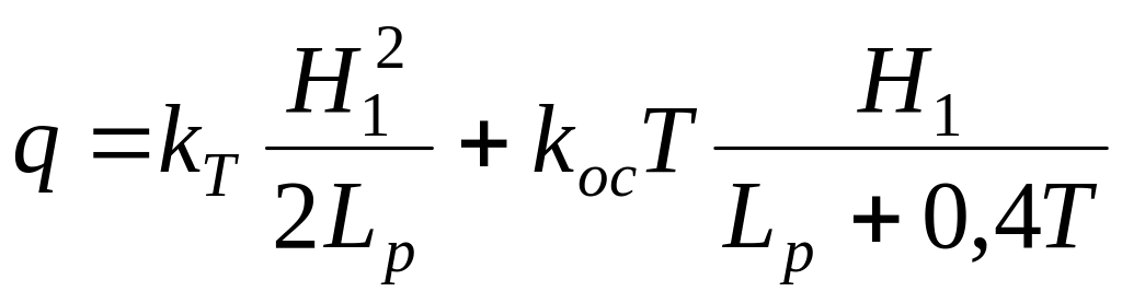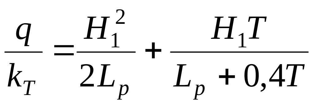 Для схемы с внутренним дренажом при одинаковой проницаемости грунтов тела дамбы и основания (рис. 4.2. в) удельный расход определяют по формуле