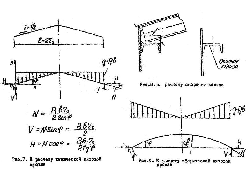 Сферическое покрытие с радиальными ребрами рассчитывается аналогично коническому щитовому покрытию, рассмотренному в предыдущем разделе. Рассмотрим лишь некоторые отличительные черты.