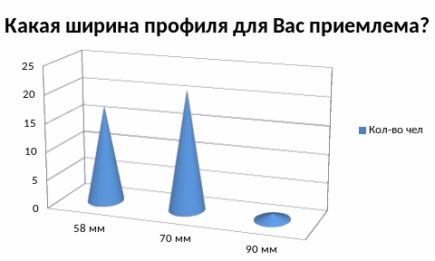 В нашем регионе люди не спешат устанавливать окна с шириной профиля в 90мм, мнение разделилось на две категории, 44% опрошенных предпочитают профиль, шириной 58 мм, и 54% опрошенных считают более приемлемым профиль 70 мм.