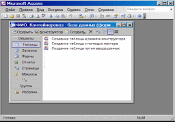 На вкладке «Таблица» (смотри рисунок ниже текста абзаца) окна «База данных» выполните команду «Создание таблицы в режиме конструктора».
