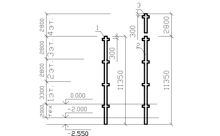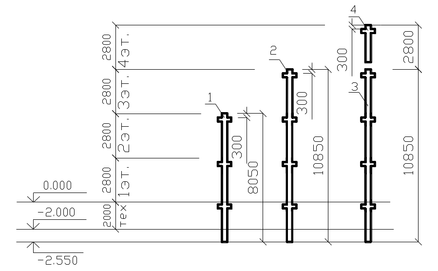 Рисунок 19 – Колонны каркаса сечением 300х300 мм для зданий с техподпольем высотой 2000 мм с высотой этажей 2800 мм.