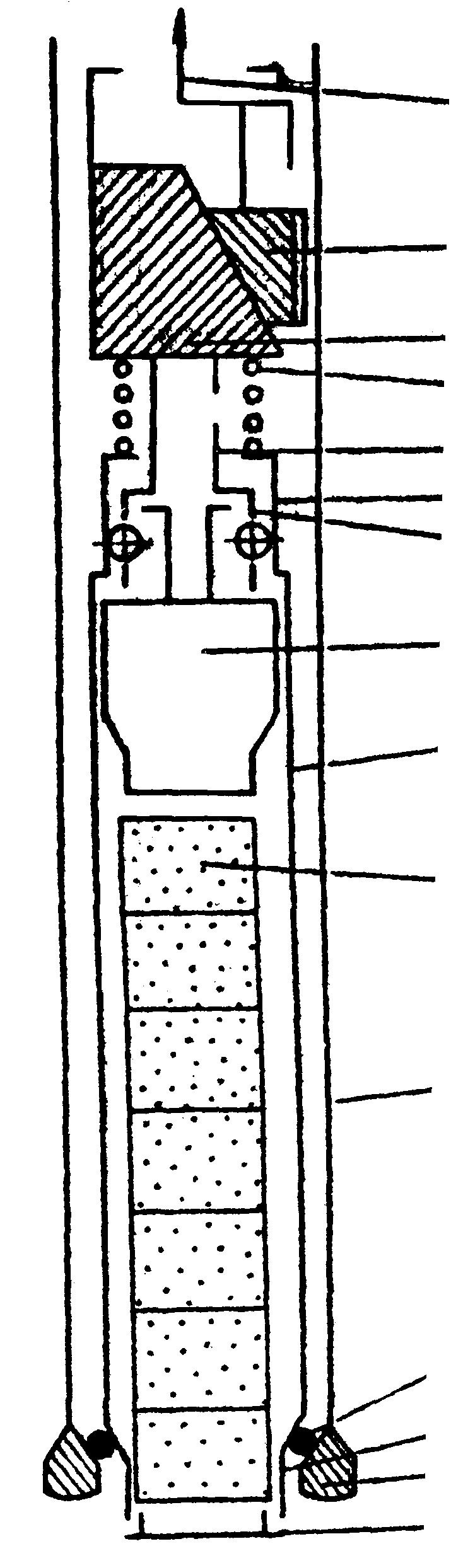 После этого выключают насос и опускают с вращением колонну бурильных труб на забой скважины. При этом происходит освобождение нижней секции 3 от герметичного срезного днища 1 и перемещение контейнера 7 вверх относительно полого штока 11, сжатие пружины 12, фиксация плашек 14 внутри колонны бурильных труб 5 и вывод кольцевой проточки 16 поршня 8 из зацепления с фиксатором 9.