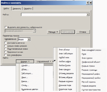 MS Word позволяет кроме строки текста искать (и заменять) различные настройки форматирования. Выбор варианта формата открывает соответствующее диалоговое окно. Можно также искать примеры форматирования, не вводя текст в поле Найти.