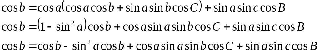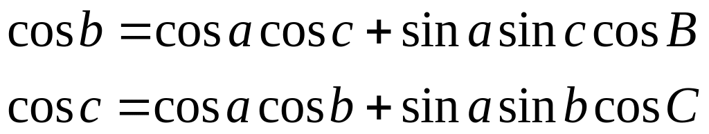 Щоб одержати формули п’яти елементів, скористуємось формулою косинусів сторін сферичного трикутника.