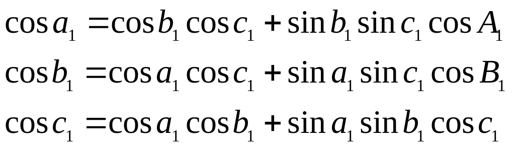 Щоб одержати формули косинусів кутів сферичного трикутника запишемо співвідношення (2.3) для сторін полярного трикутника по відношенню до трикутника :