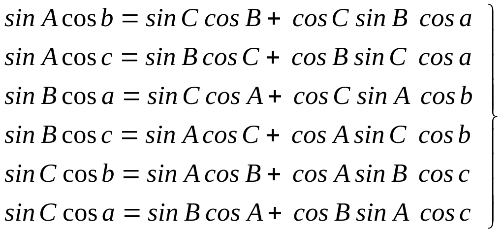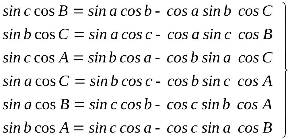Добуток синуса сторони на косинус прилеглого кута дорівнює добутку синуса третьої сторони на косинус протилежної цьому куту сторони без добутку косинуса третьої сторони на синус тієї ж протилежної сторони і на косинус кута між ними.