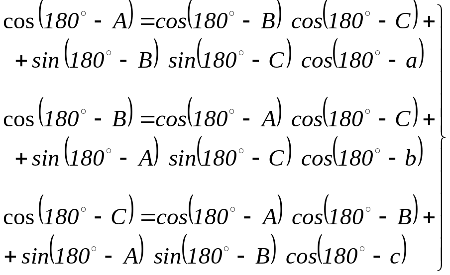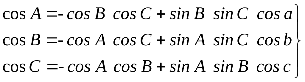 Скористуємось формулами зведення тригонометричних функцій та помножимо на від’ємну одиницю обидві сторони кожного співвідношення (2.4′′′). В результаті одержимо формули косинусів кутів сферичного трикутника.