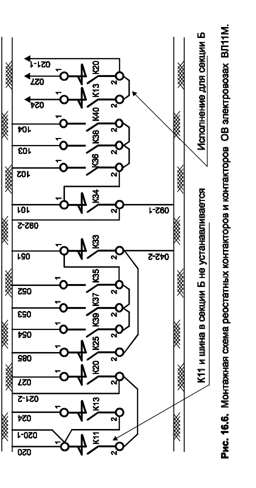 Угловой реостатный контактор К15. При обоих вариантах монтажной схемы от верхнего кронштейна 1 (продолжение рис. 16.4 и 16.5) отсоединить провода 027 и 027-1. От нижнего кронштейна 2 отсоединить провода 028-1, 028-2 и перемычку. Перемычку отогнуть и соединить её при помощи дополнительной перемычки соединить с проводами 027, 027-1, 028-1, 028-2 и надёжно заизолировать.