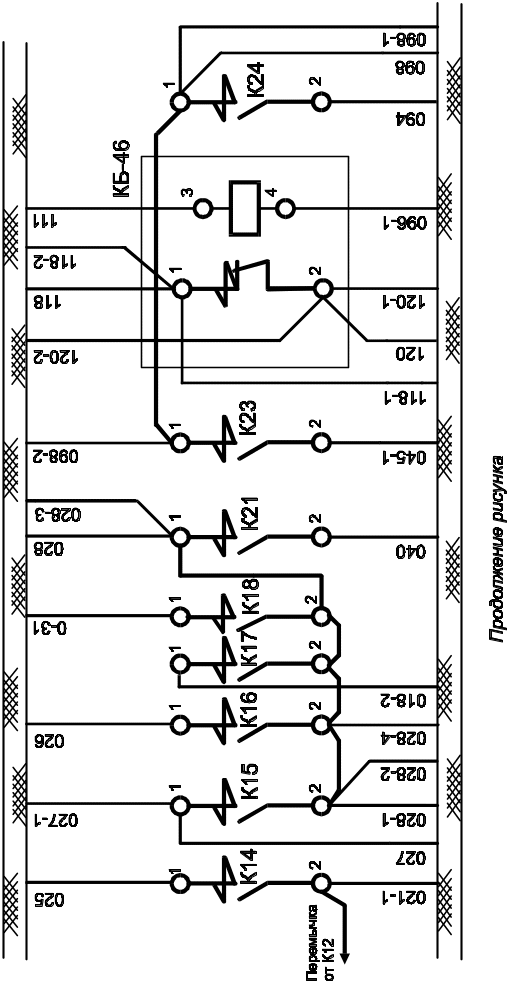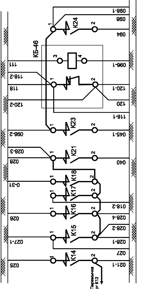 Линейный контактор К18. При обоих вариантах монтажной схемы от верхнего кронштейна 1 (продолжение рисунков 16.4 и 16.5) отсоединить провод 031 и закрепить его на верхнем кронштейне контактора К21. От нижнего кронштейна 2 отсоединить и отогнуть перемычку, шину и соединить их вместе или провод 031 нарастить дополнительной перемычкой, соединить её с перемычкой и шиной, отсоединённых от нижнего кронштейна, и надёжно заизолировать.