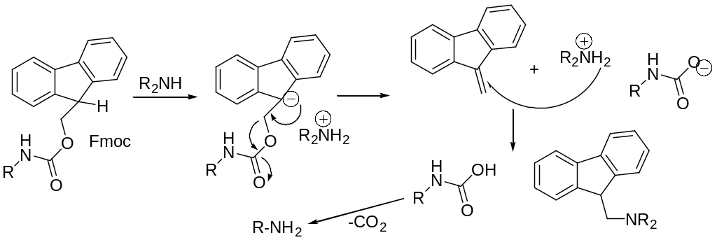 Пример снятия защиты 9-флуоренилметоксикарбонильной (Fmoc). Механизм E1CB. Пиперидин или морфолин в ДМФА.