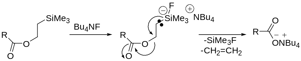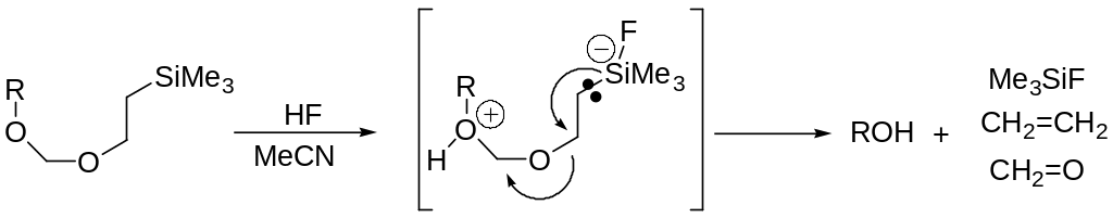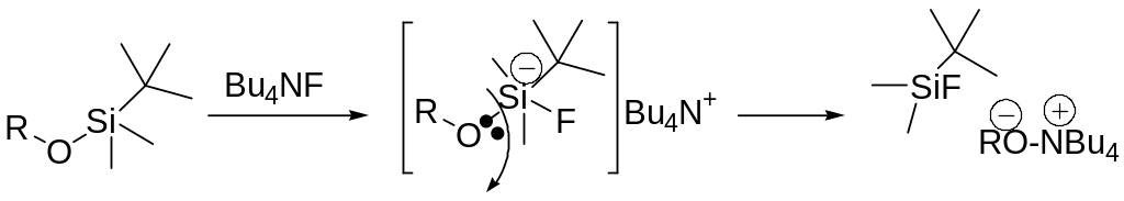 Однако триалкилсилильная группа может быть снята действием Bu4NF в ТГФ или HF в ацетонитриле, KF в ДМСО. Это обусловлено возможностью взаимодействия F- с вакантными орбиталями атома Si с образованием пентакоординационного атома кремния.