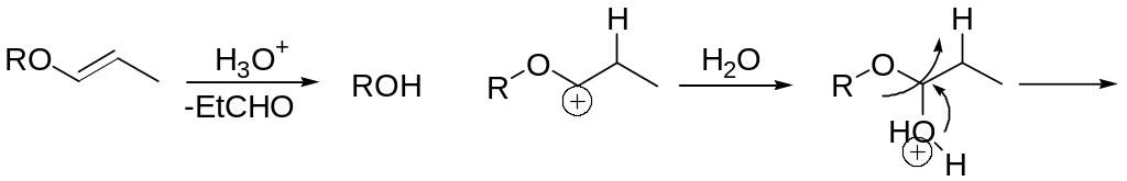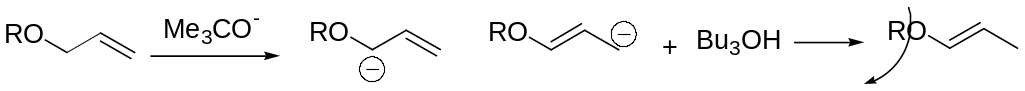 Аллиловые простые эфиры стабильны в сильно щелочной среде, но расщепляются tBuOK в ДМСО, включая двухступенчатый процесс, вовлекающий изомеризацию двойной связи. При этом образуется эфиры енолов, которые гидролизуются мягкими кислотами.