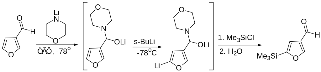 Когда требуется защитить на 1-2 стадии. Для того, чтобы провести реакции по менее активной кетонной функции оксоальдегида А. Альдегидную функцию защищают N-метиланилидом лития, затем проводят реакцию по кетогруппе. При водной обработке реакционной смеси временная защитная группа симается.
