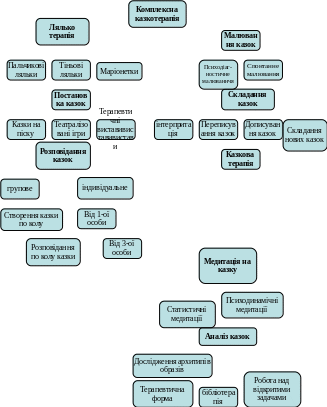 На заняттях казкотерапіїї ми використовуємо різні види роботи, які представлені на схемі "Комплексна казкотерапія"