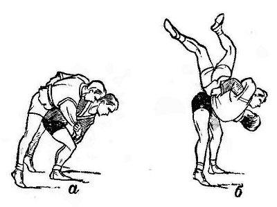 а) взбрасывание на бедро. Перенести тяжесть тела противника на его пятки или влево–вниз и в темп сопротивления противника сильным рывком руками на себя и вправо взбросить противника на подворачиваемое навстречу этому движению бедро;