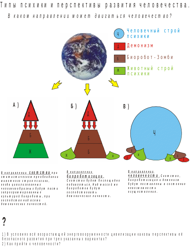 Современная цивилизация – скрытый матриархат под диктатом животных инстинктов и общим контролем демонических личностей, опирающихся на пастухов – биороботов. Для сохранения шансов к развитию цивилизации необходим выход из общества с животным строем психики в общество с человечным строем психики.