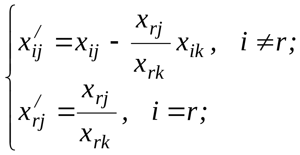 Всі значення в клітинах при побудові нової симплексної таблиці зі стовпця A0 по сn-ий і з першого рядка по (m+1)-ий перераховуються при переході до нового опорного плану у відповідності до наведених нижче рекурентних формул: