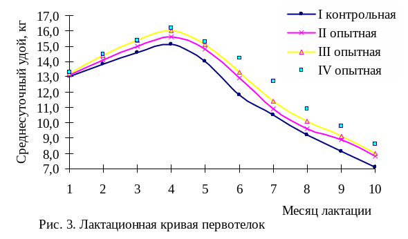 За третий месяц опыта среднесуточные удои в контрольной подгруппе составили 14,6 кг. Первотелки второй и третьей подгрупп давали по 15,0-15,4 кг, что на 2,7-5,5%, р>0,05 больше, чем в первой. Удои в четвертой подгруппе возросли до 15,4 кг, что на 0,8 кг, на 5,5%, р< 0,05 больше, чем в контроле. В четвертый месяц опыта повышение удоя во всех подопытных подгруппах продолжалось, и они были самыми высокими за всю лактацию. Животные второй и третьей подгрупп имели среднесуточные удои молока на 0,5-0,9 кг (3,3-6,6%, р>0,05) выше, чем контрольные. В четвертой подгруппе уровень среднесуточных удоев достиг 16,2 кг, что на 7,3% (р<0,05) больше, чем в контроле.