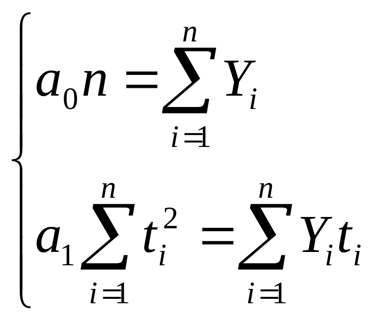 Параметри a0 a1 вихідної прямої, які задовольняють принципу найменьших квадратів, знаходять шляхом рішення наступної системи нормальних рівнянь: