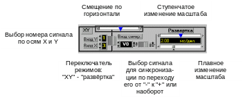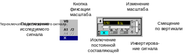 Для его включения необходимо подать на вход коннектора исследуемые сигналы, включить и настроить, как описано выше, блок «Приборы I» и выбрать в меню этого блока строку «Осциллограф». После этого на дисплее появится изображение виртуального прибора «Осциллограф» (рис. 1.15). Назначение всех его окон показано на рисунке.