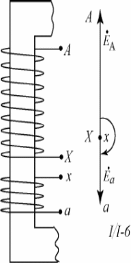 Изобразим фрагмент стержневого магнитопровода однофазного двухобмоточного трансформатора (рис. 1.16). Обе обмотки намотаны по левой винтовой линии, имеют одинаковое направление намотки. У обеих обмоток начала А и а находятся сверху, а концы Х и х – снизу, т.е. одинаково промаркированы.